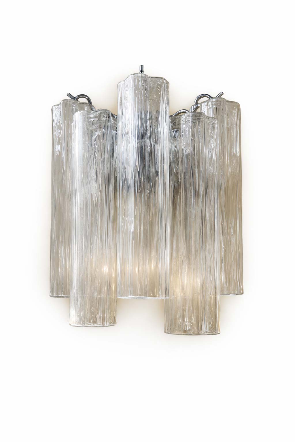 Questo applique da parete unisce il fascino senza tempo del vetro veneziano con la forza scultorea delle forme verticali. Ogni elemento è realizzato a mano, utilizzando canne di vetro trasparente modellate secondo la tradizione muranese. Il risultato è un oggetto che cattura la luce e la rifrange in modo unico, creando giochi visivi di grande effetto.